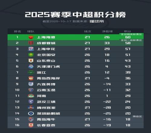 北京时间10月17日,中超联赛第27轮结束了第一比赛日的较量,联赛前三海港、成都和申花分别战胜了各自对手。