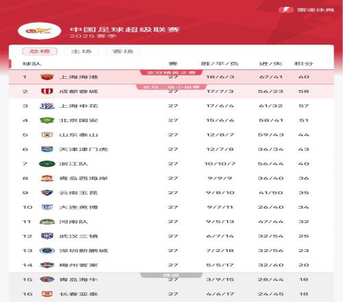 雷速体育10月19报道 随着长春亚泰客场0-2不敌河南队,中超联赛第27轮全部赛程结束,上海海港在本轮以4-3险胜青岛海牛,积60分以2分优势继续领跑积分榜,蓉城、申花本轮有惊无险取胜紧随其后,北京国安换帅后不敌保级队深圳新鹏城,彻底掉出争冠行列。青岛海牛、长春亚泰本轮均输球,两队同积18分深陷降级区。