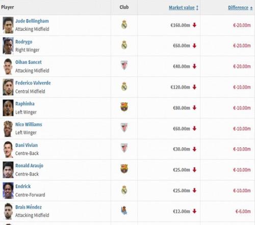 北京时间12月12日,德国转会市场更新了西甲球员身价,新一期的身价跌幅榜也随之产生。其中贝林厄姆、罗德里戈下跌2000万欧,巴尔韦德、拉菲尼亚下跌1000万欧。