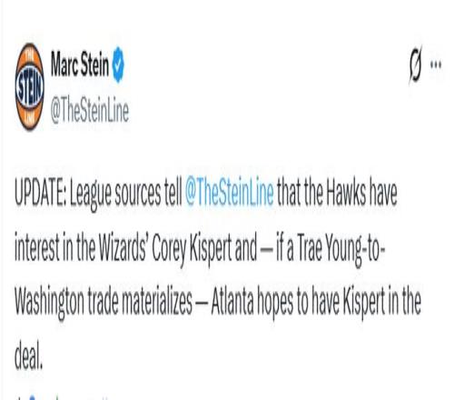 此前,Shams报道,特雷-杨的经纪人团队仍在与老鹰管理层持续沟通,致力于达成特雷-杨离队的交易方案。消息源同时指出,老鹰队也在多条交易线索上积极推进谈判。名记Stein报道,老鹰对奇才的基斯珀特感兴趣,希望将他加入到杨的交易中,赛前,基斯珀特也确定因伤病管理缺阵。