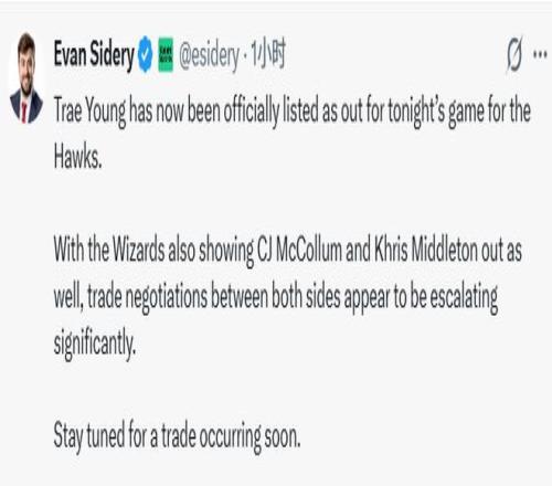 北京时间1月8日,就在名记Shams报道奇才成为特雷-杨的首选下家后不久,名记Sidery跟进指出,特雷-杨已被老鹰队正式列入今日比赛的缺席名单。与此同时,奇才队也宣布CJ-麦科勒姆、米德尔顿、基斯珀特也将缺席今日的比赛。种种迹象表明,两队围绕特雷-杨的交易谈判正显著升级。