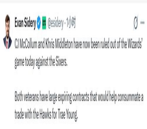 Sidery还表示,一笔交易或将很快达成。奇才的麦科勒姆和米德尔顿这两位老将均持有大额到期合同,这将有助于促成奇才与老鹰关于特雷-杨的交易谈判,使薪资匹配更具可行性。