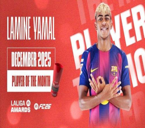 亚马尔在11月当选西甲月度最佳球员后,12月再度获得该项荣誉。过去一个月,他在多场比赛中扮演关键角色,帮助巴塞罗那在2025年最后一个月的四场比赛中全部取胜。