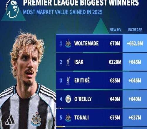 英超球员2025年身价涨幅榜:沃尔特马德暴涨6250万欧第1