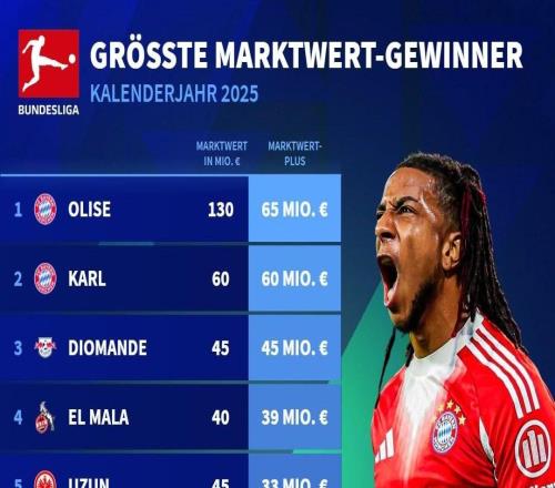 德甲球员2025年身价上涨榜:奥利塞、卡尔前2,迪奥曼德第3